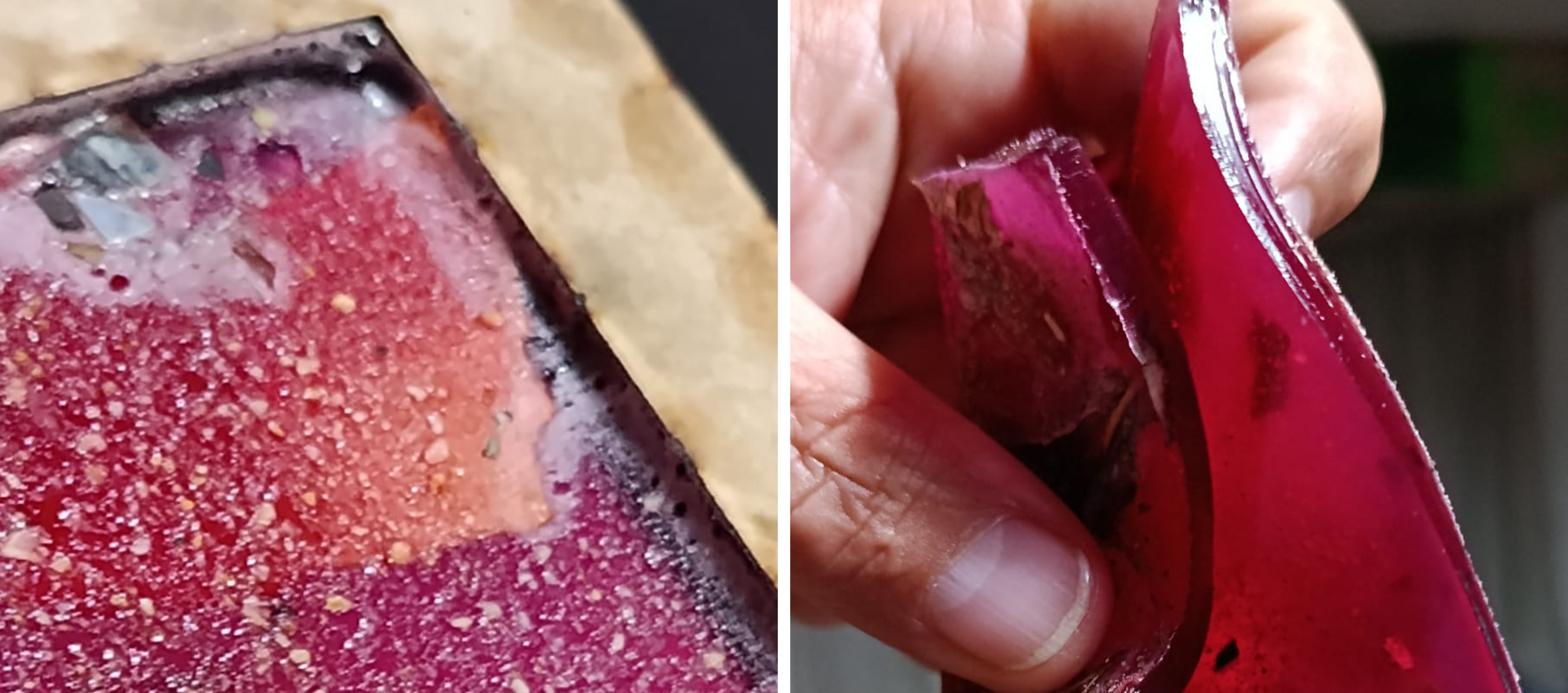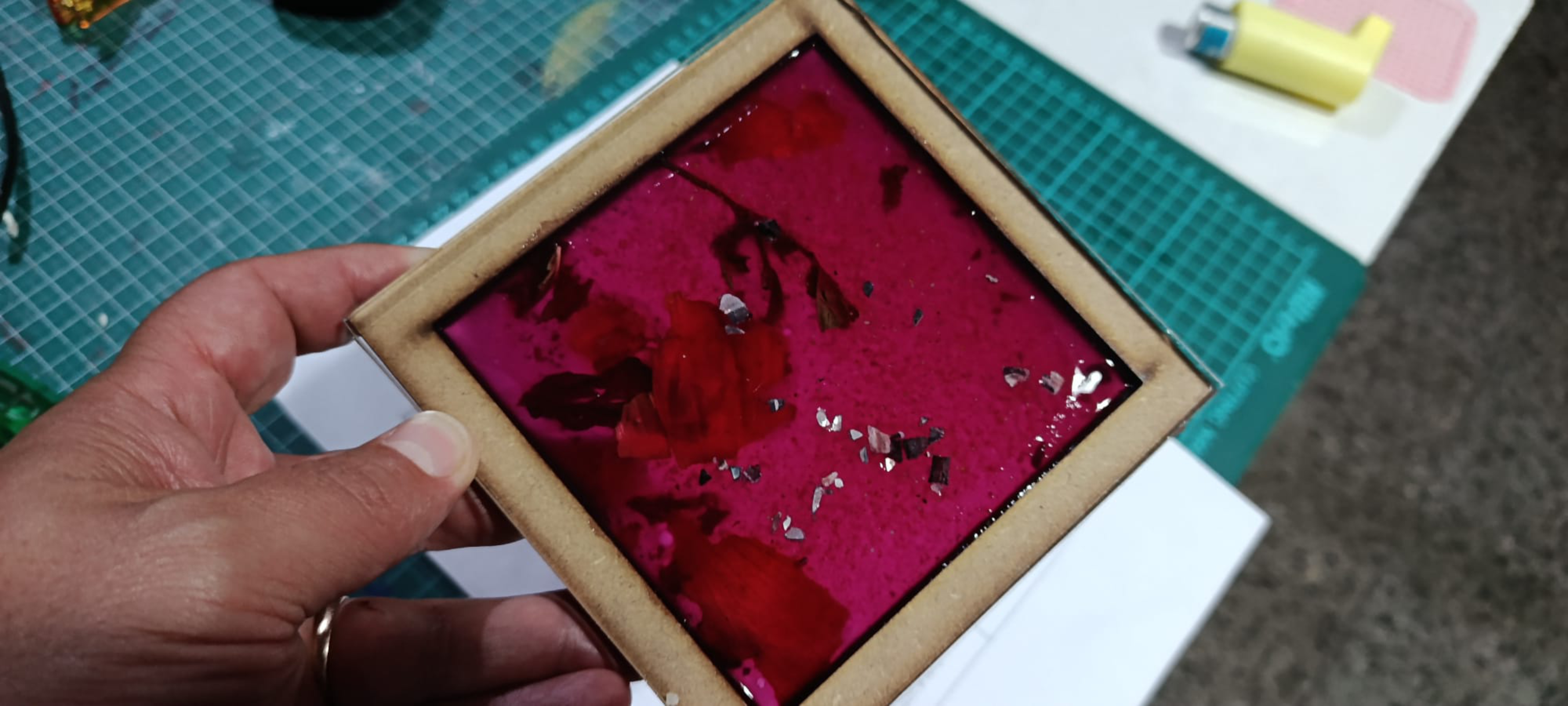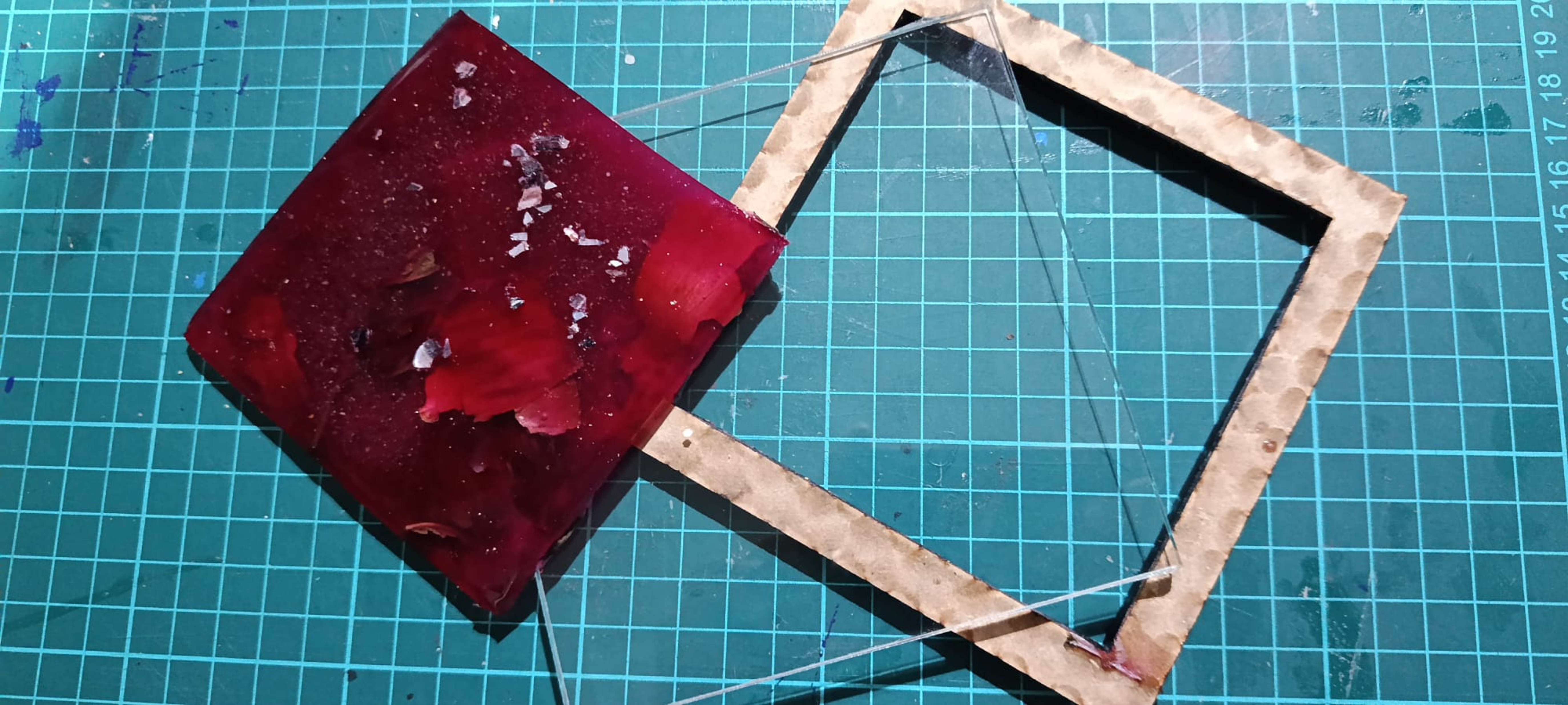 Como el molde es un marco de MDF de 5 mm y una base cuadrada de acrílico de 3 mm, hay que esperar a que enfríe para poder verter. El vertido se puede hacer de varias maneras porque la materia tiene un buen tiempo de trabajo antes de la gelatización.