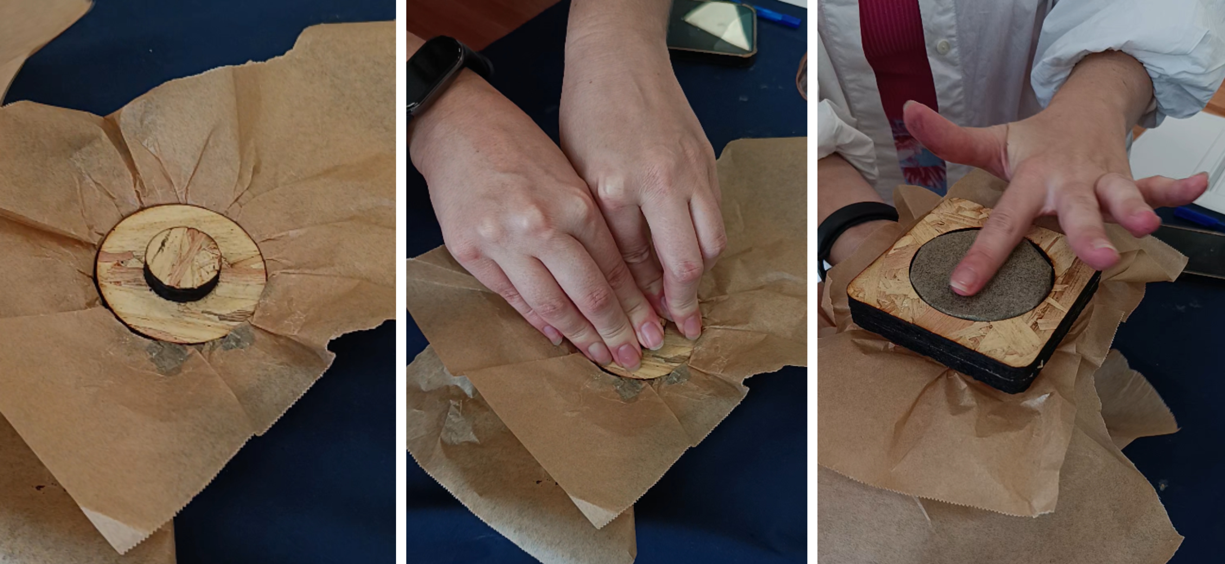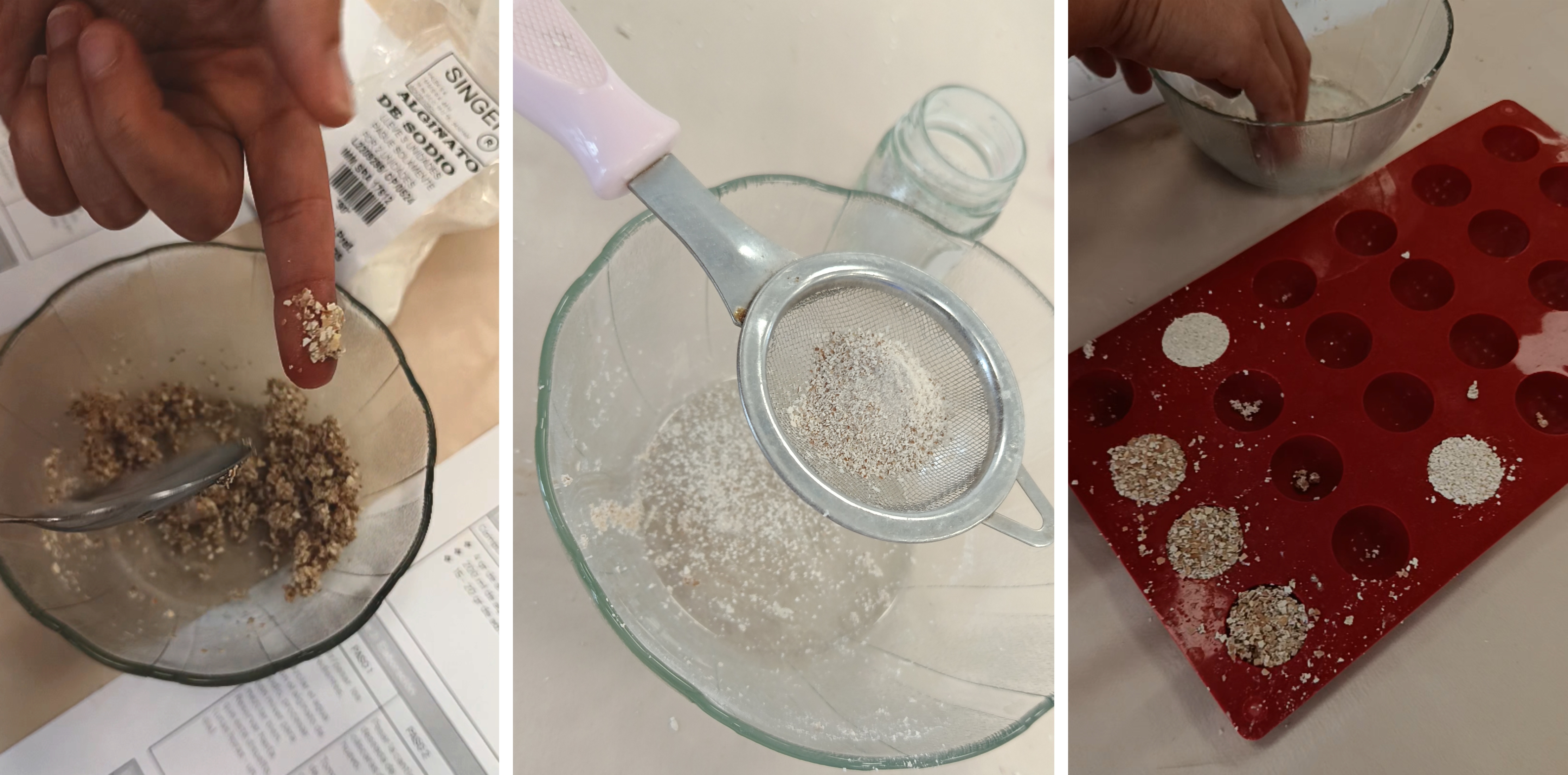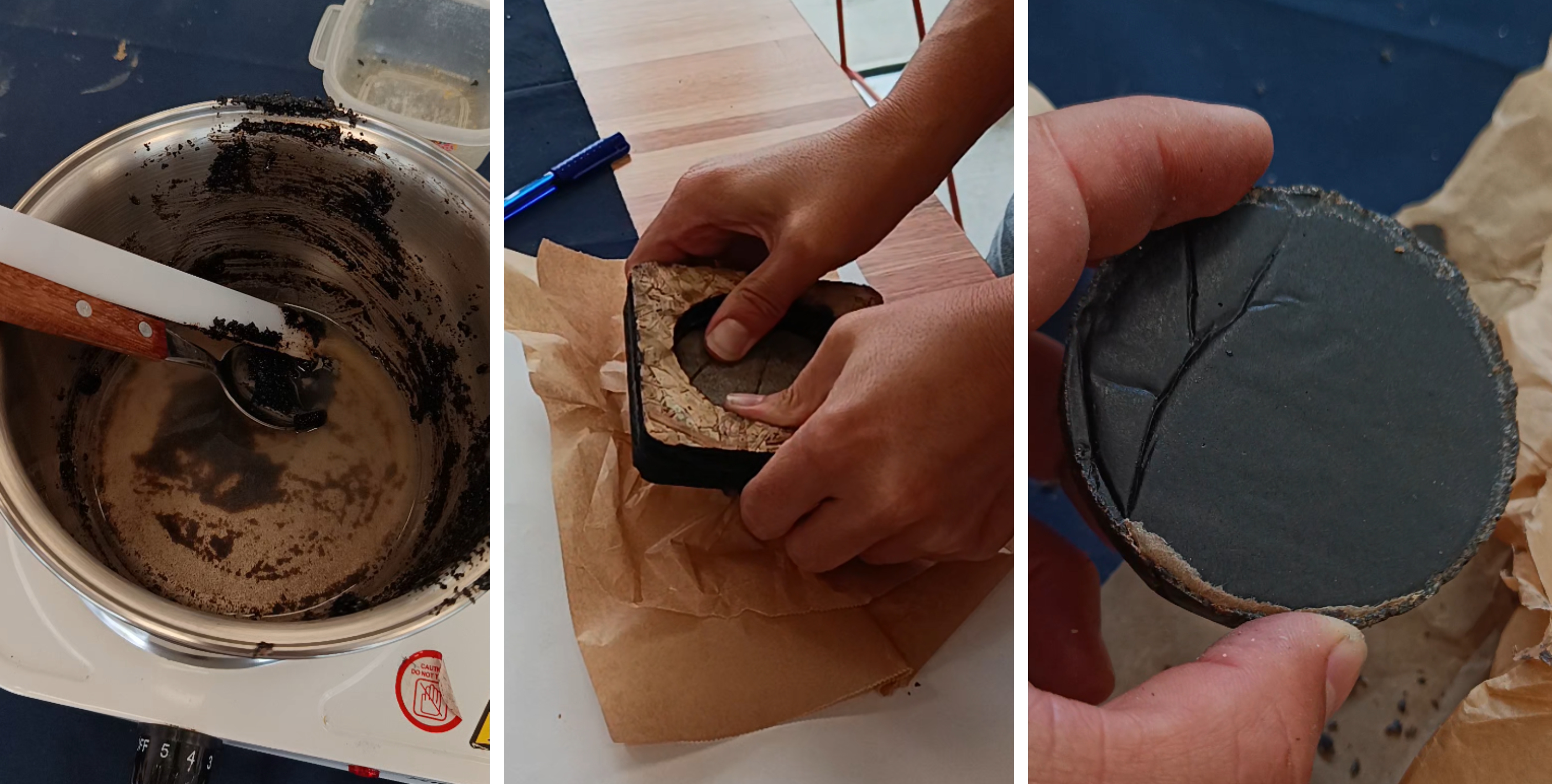 Se usaron distintos tamices y se notaron distintos resultados de aglomeración: cuanto menor la granulometría, mejor comportamiento de elasticidad y control de la forma. El resultado de esta receta es un objeto sólido como una piedra, resistente y compacto; el tiempo del curado recomendado es de dos días mínimo.