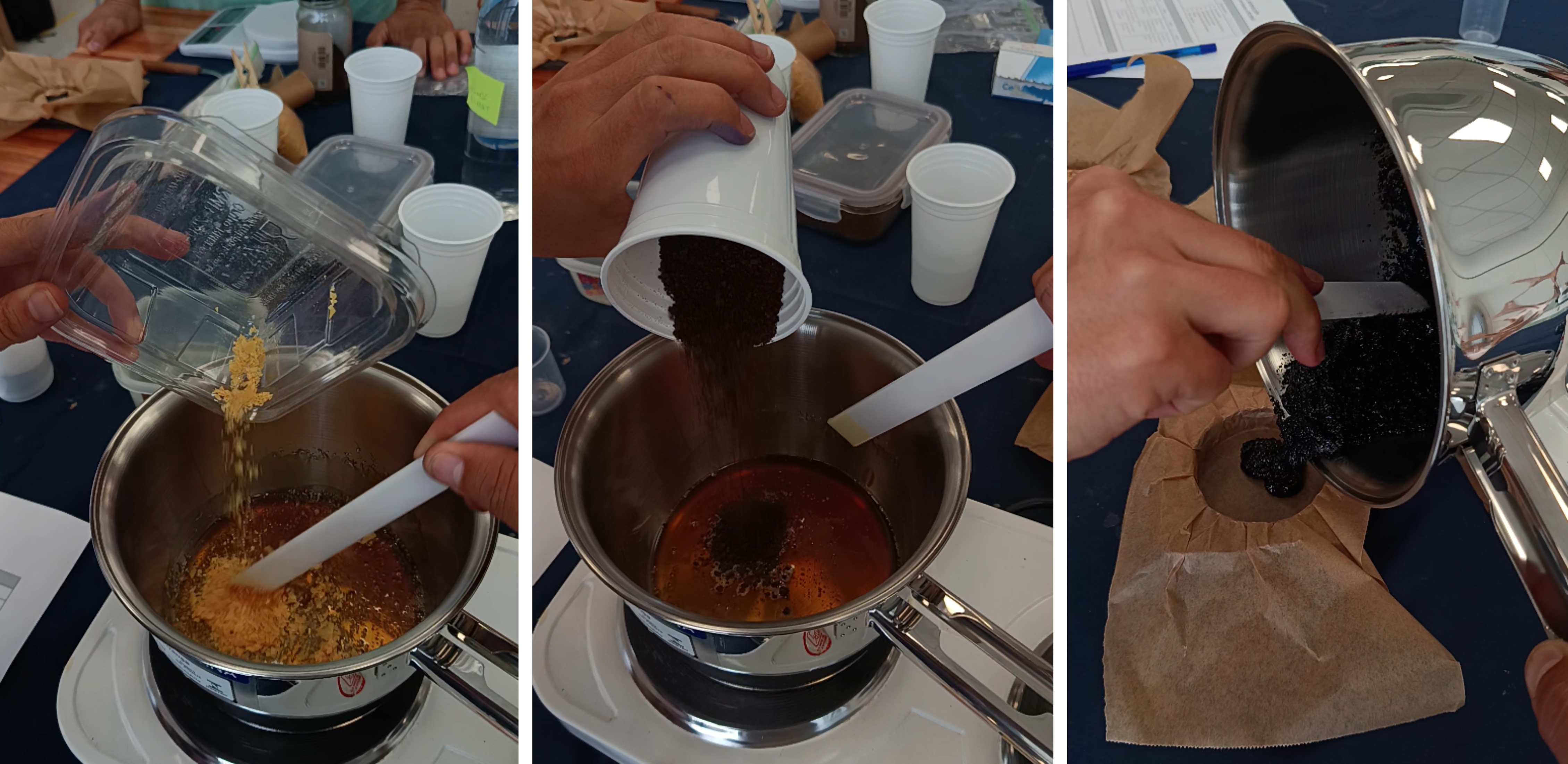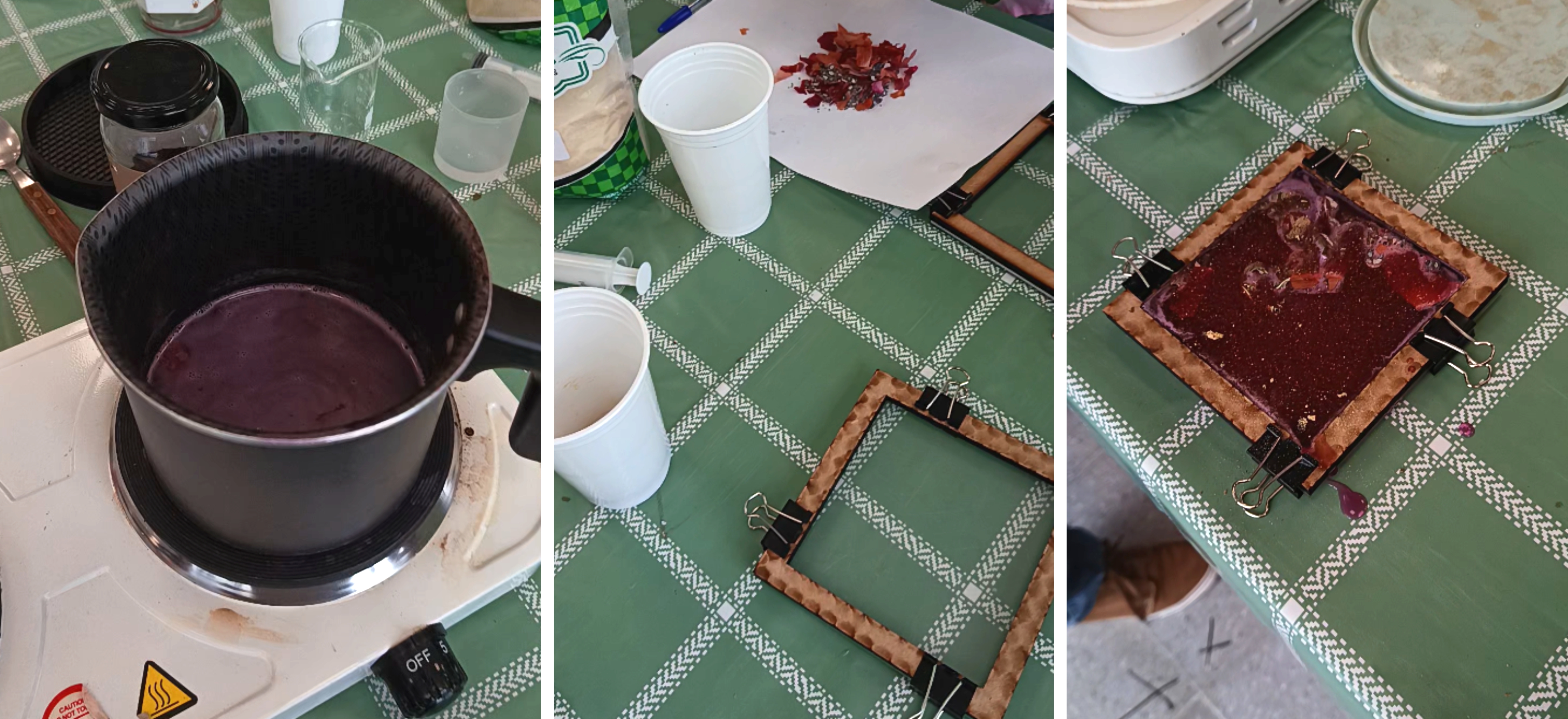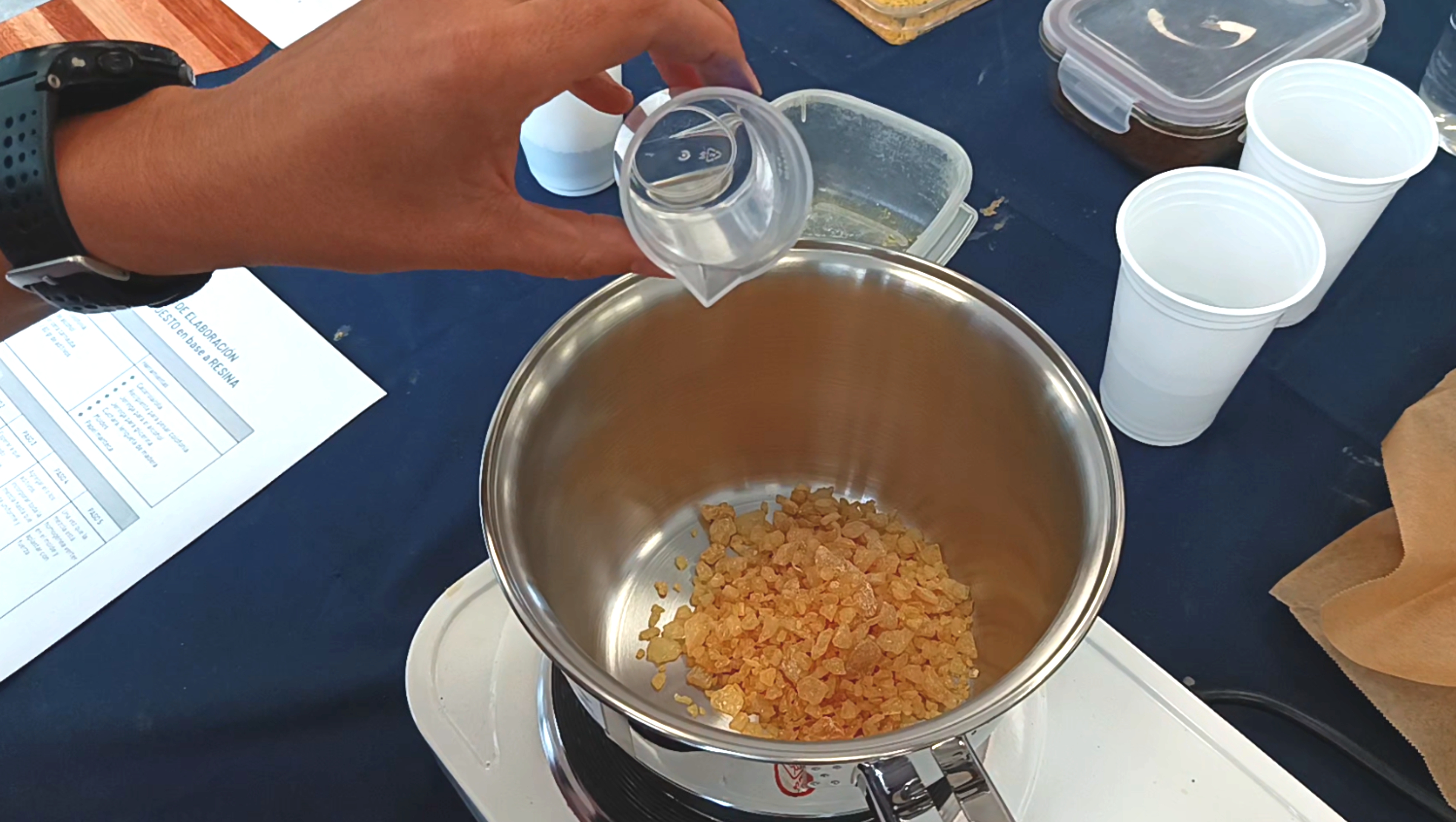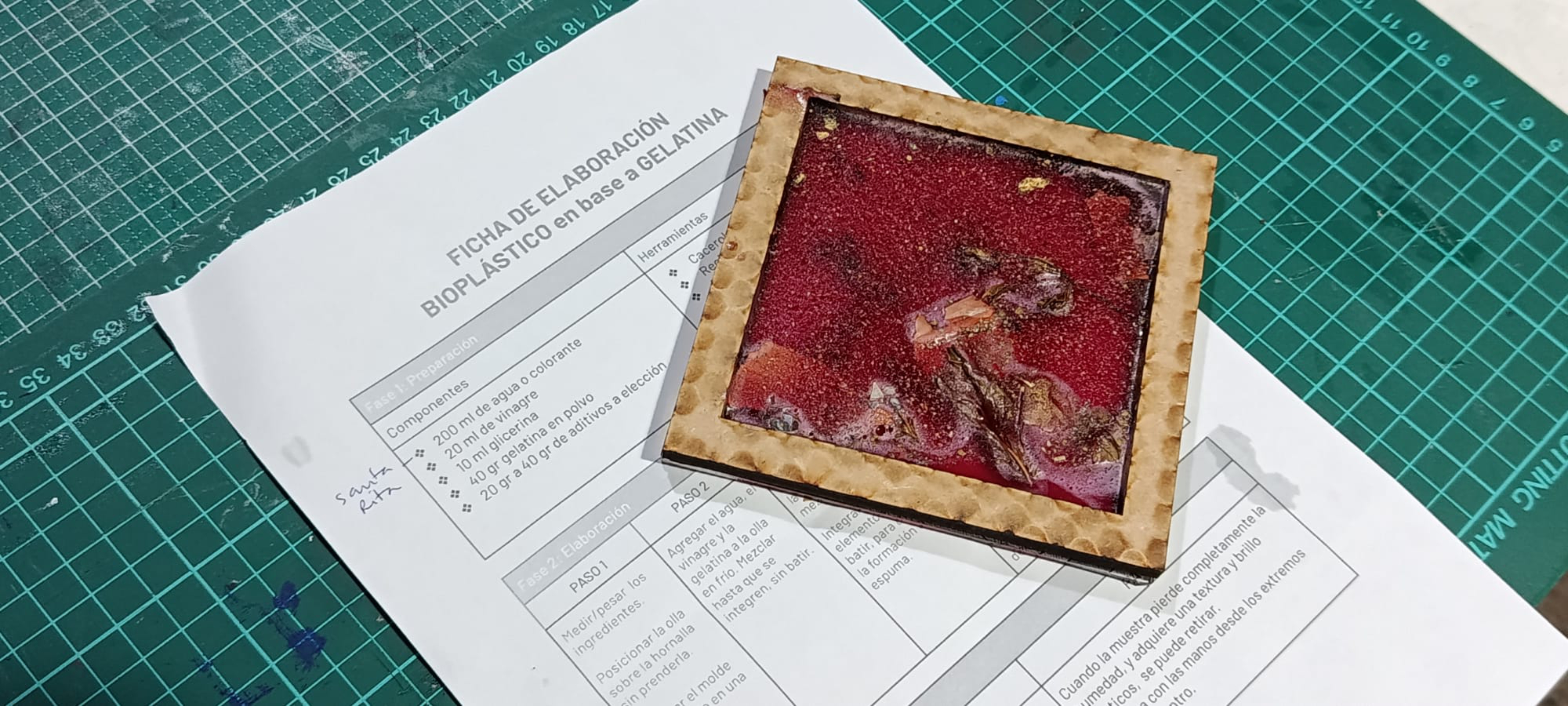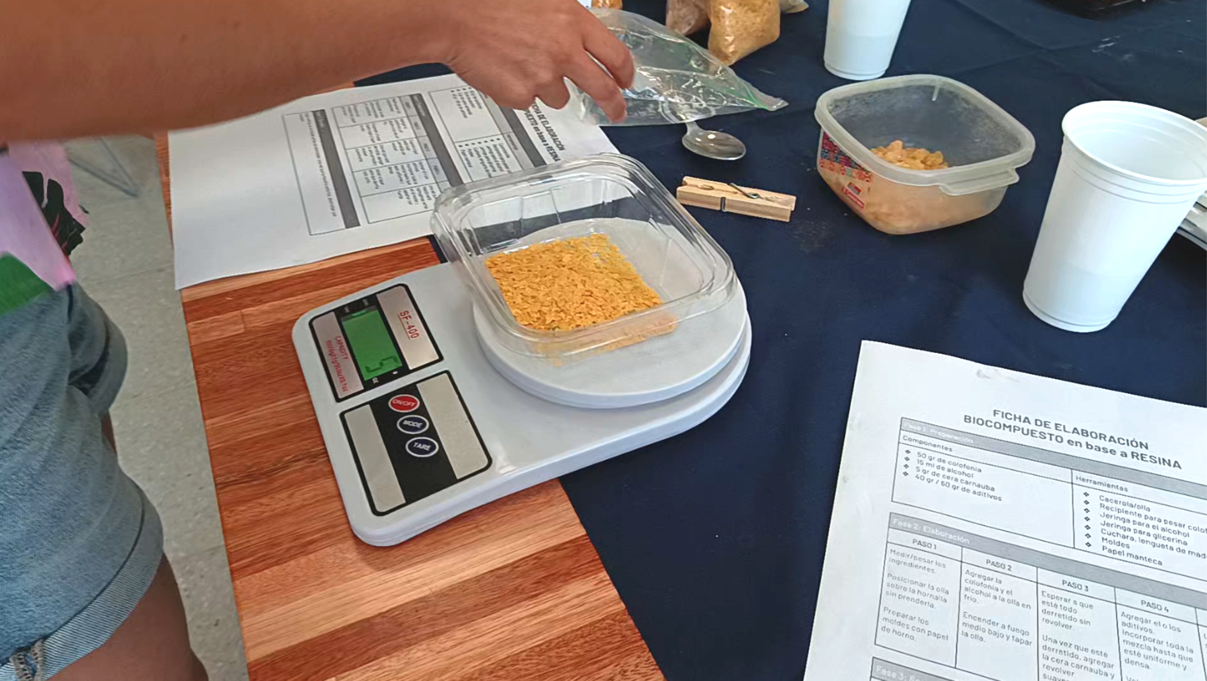 En la estación 2 usamos resina de pino para lograr un bioplástico. La colofonia es literal resina de pino la que se usa para depilación. El resultado de esta receta es un plástico muy rígido y resistente; por ese motivo, el molde debe ser de madera y con alta resistencia al calor.