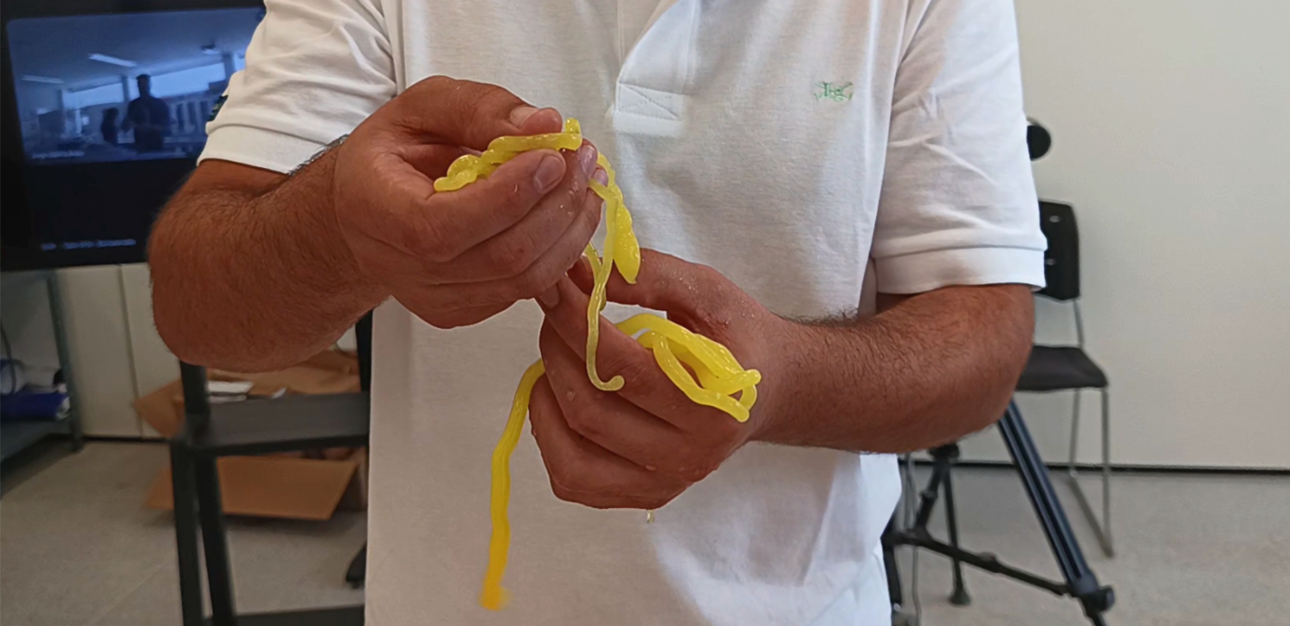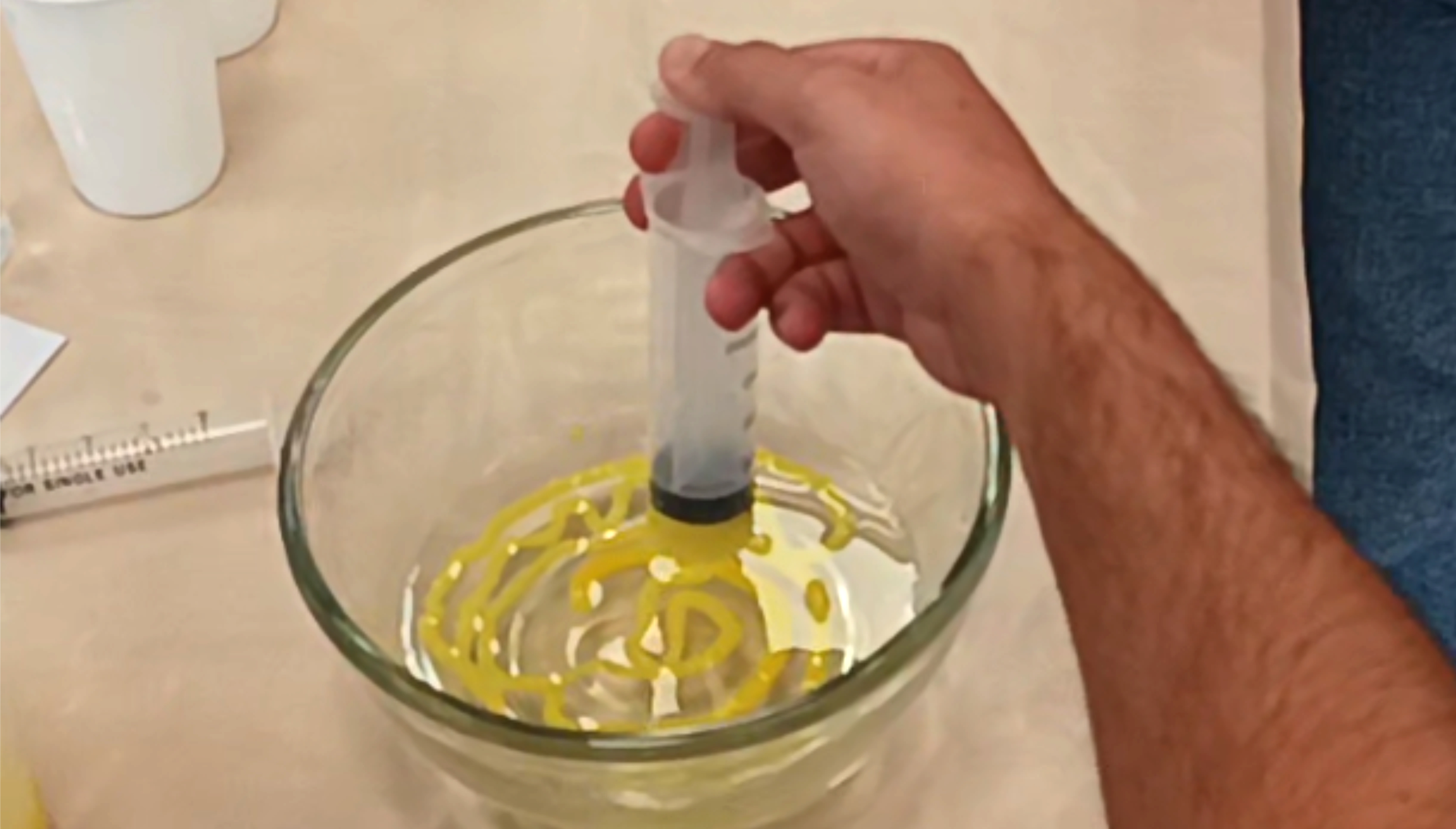 Si bien el tiempo no nos alcanzó para realizar el ejercicio de la estación 4, se pudo registrar la técnica de extrusión con jeringa. Una biosilicona que gelatiniza al contacto con agua y genera hilos que se pueden dejar secar y quedan elásticos y resistentes.