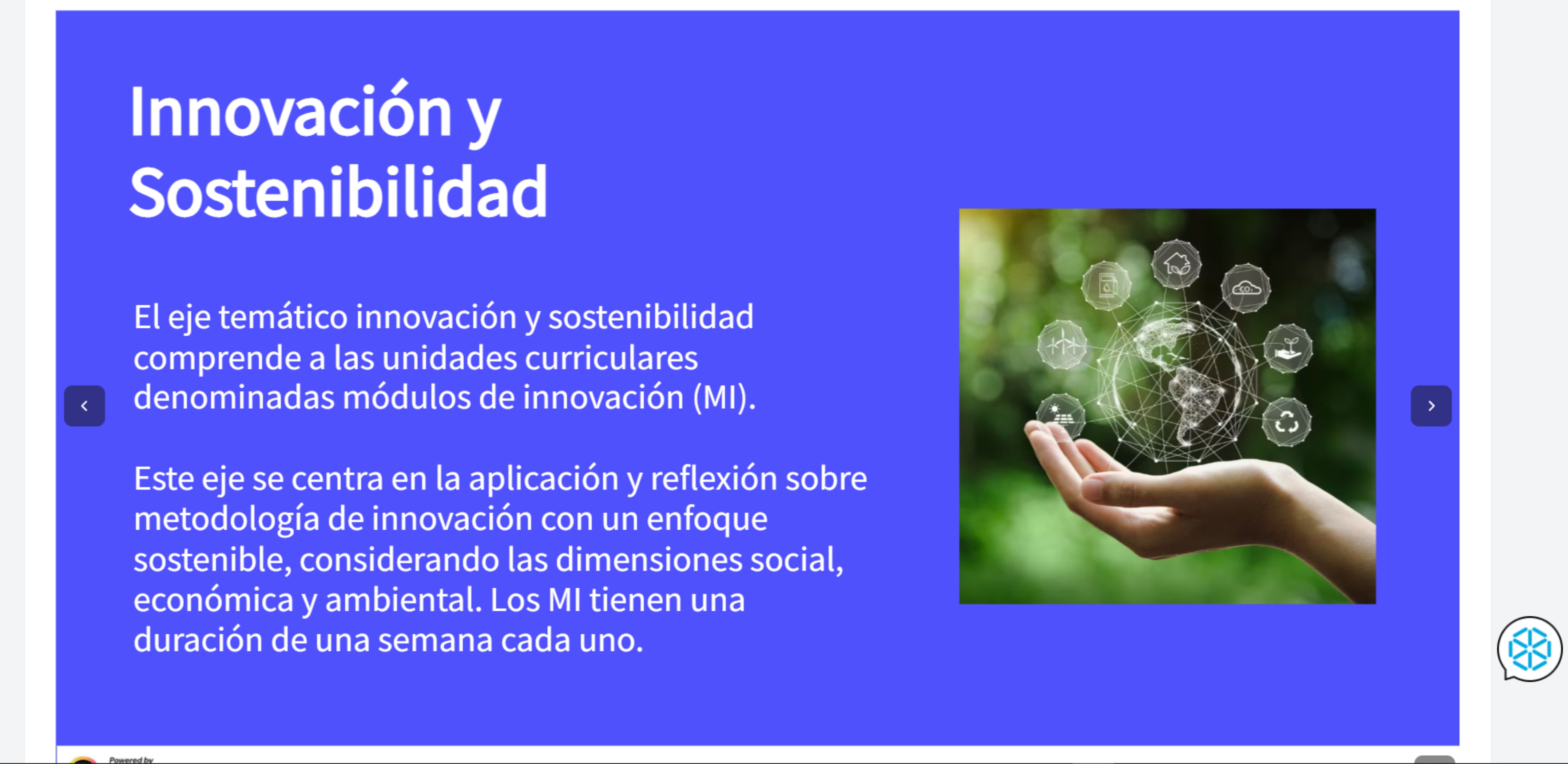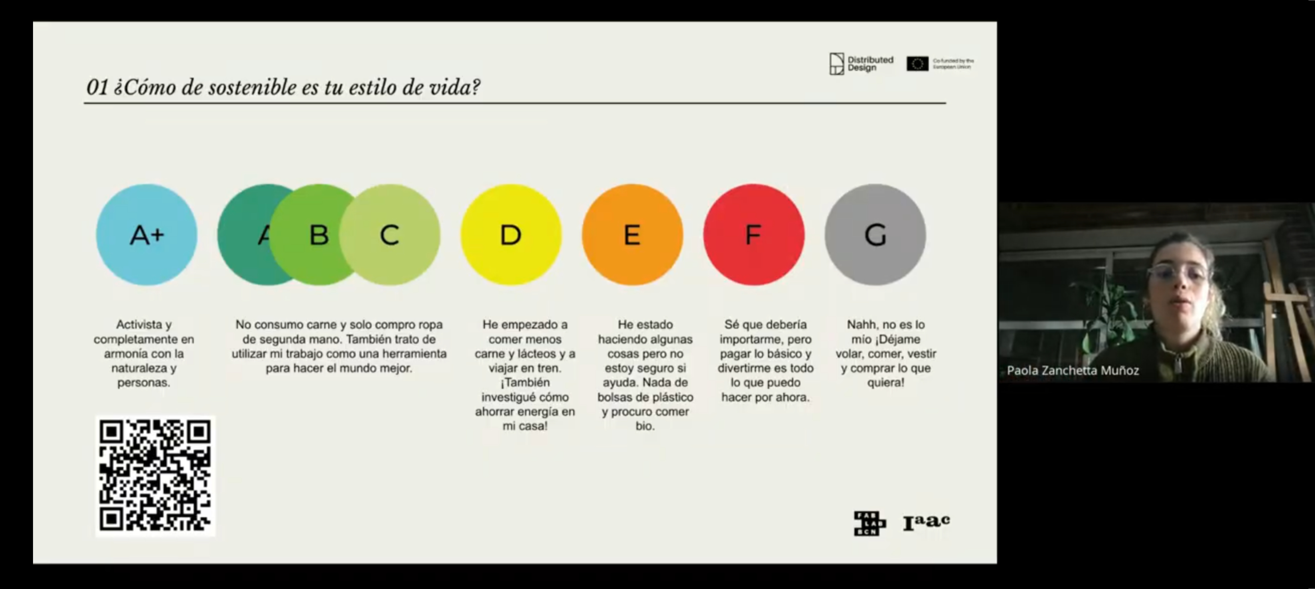 En el tercer módulo de innovación, profundizamos en estrategias de sostenibilidad, midiendo qué tan sostenible es nuestro estilo de vida. En una escala de 8 colores se definen hábitos de consumo donde, según la docente, a la derecha están los menos legitimados y hacia la izquierda del espectro cromático están los más armoniosos con la ideología de sostenibilidad, validados como los amigables con las personas y con la naturaleza. Este ejercicio implica un posicionamiento político y permite contrastar visiones europeas basadas en el cambio climático y la realidad del contexto nacional desde la mirada individual.