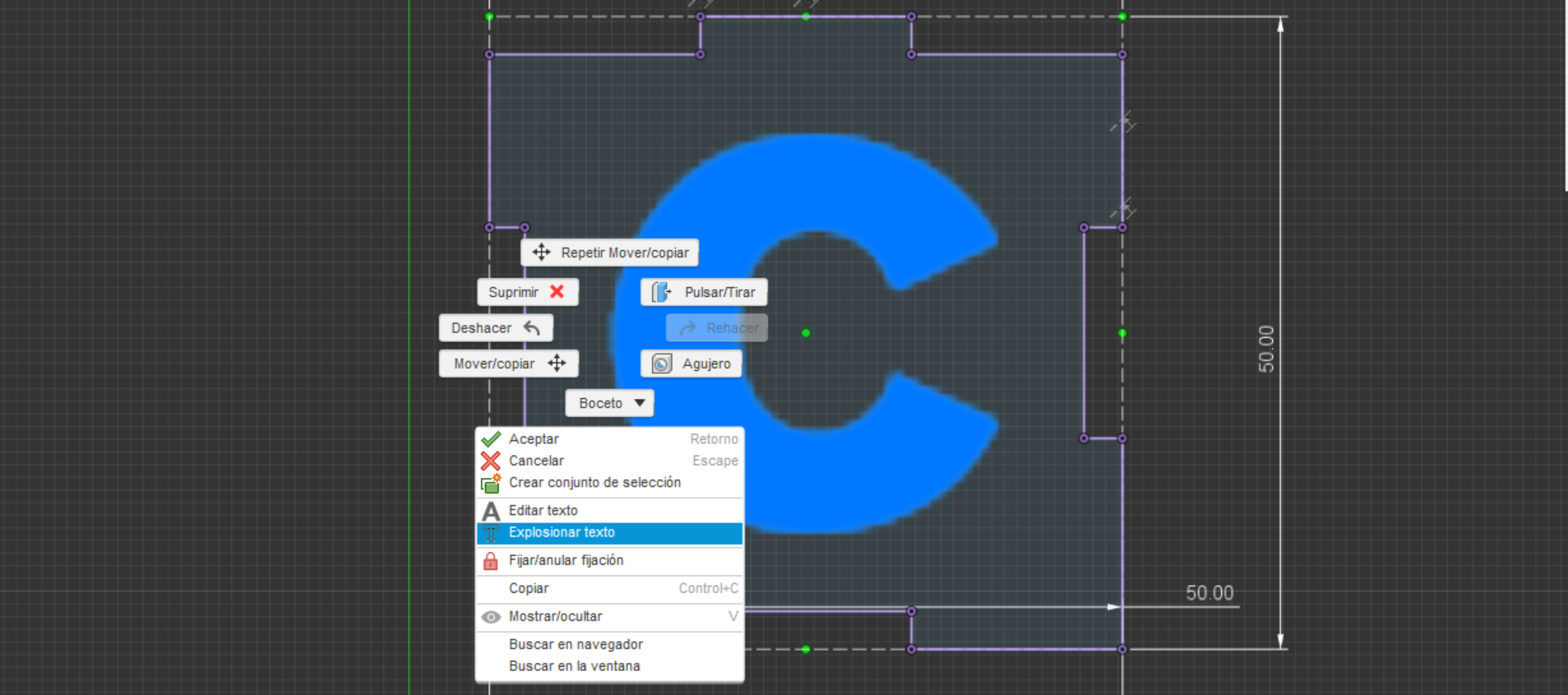 El juego con la tipografía es rígido, pero permite extruir y calar las formas. Lo interesante es que, para poder aplicar el comando de extrusión, hay que “explotar” el texto: el programa convierte así el bloque tipográfico en un dibujo vectorial editable. Lamentablemente, el archivo de este ejercicio se dañó y no pude volver a abrirlo, aunque el proceso fue una buena oportunidad para comprender mejor cómo Fusion 360 interpreta los objetos de texto.