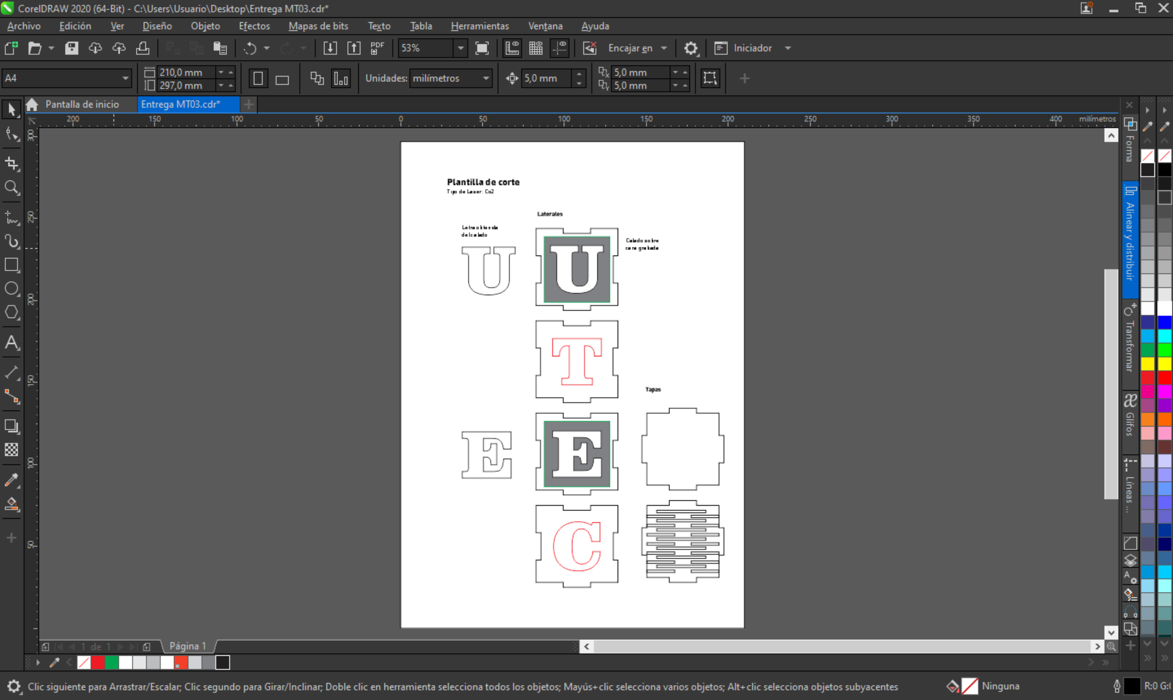 Por último, armé el archivo para el corte como pide la consigna, en vista del encuentro de laboratorio previsto para la primera semana de noviembre en Durazno. Preparé el archivo en CorelDRAW, separando las tres capas correspondientes a corte, grabado y marcado, cada una con sus colores específicos para que la máquina las interprete correctamente.