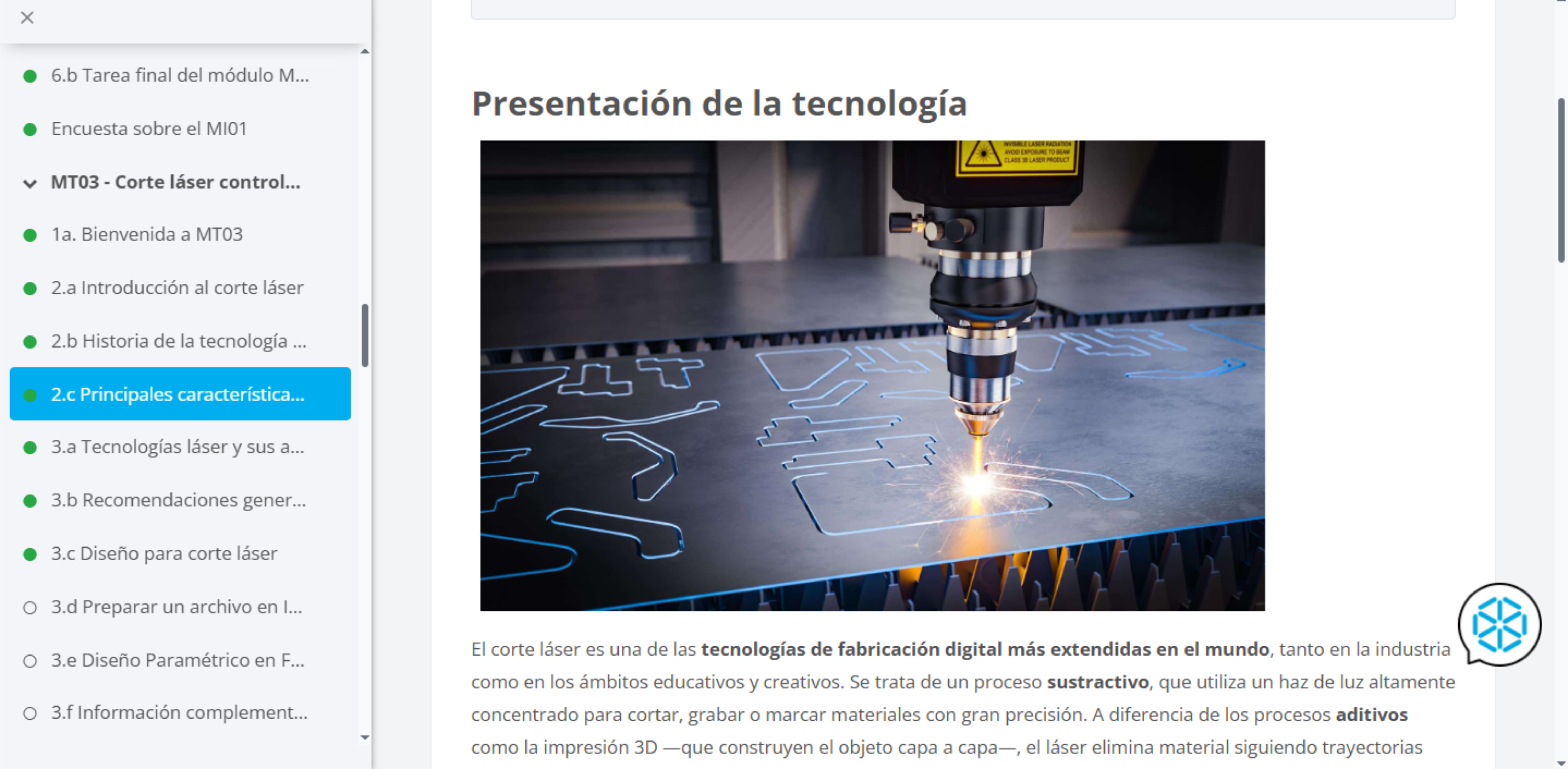 Bueno, vamos con la tecnología de corte láser. Este módulo me permitió conocer los distintos tipos de corte laser que se usan en los procesos de fabricación.